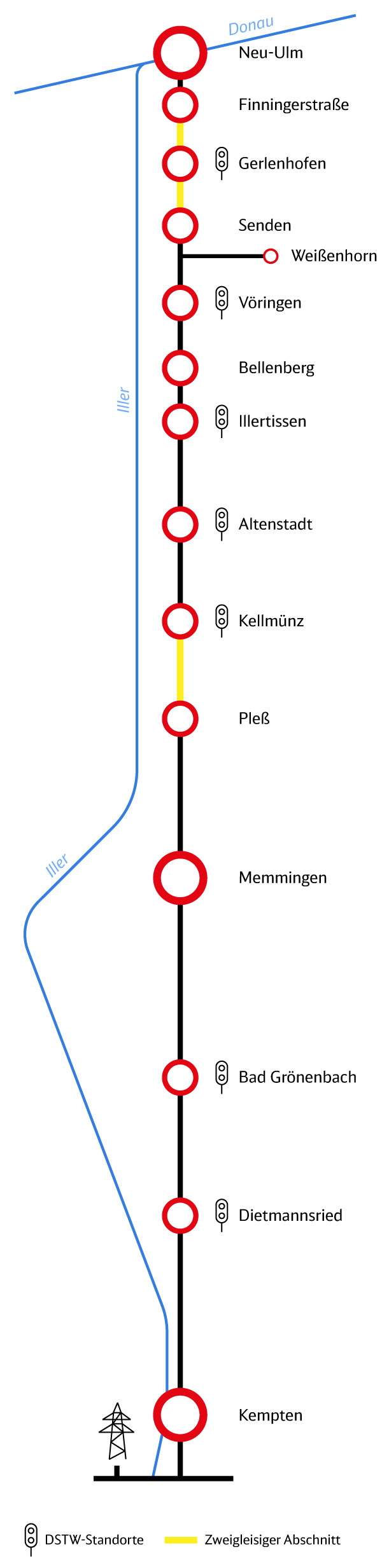 - Zweigleisiger Ausbau: Ein zweites Gleis erhalten die Abschnitte Finningerstraße – Senden sowie Kellmünz–Pleß.