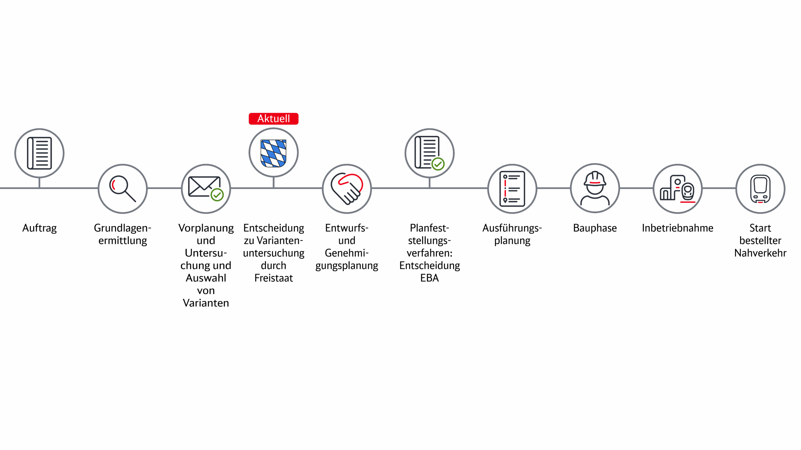 Die DB führt nun die beauftragte Planung durch. Im Anschluss an die Genehmigung durch das Eisenbahnbundesamt (EBA) und die Finanzierung durch die Verkehrspolitik setzt die DB die Planung schließlich um.